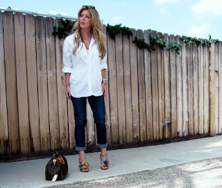 Everyone has this classy, basic piece in their wardrobe, but if you’re anything like me, it rarely sees sunshine. Since we’re moving soon, and I’m purging all clothing that I cannot justify a reason to keep, I began searching out ways to get more wear out of this basic white button-down top. Here’s today’s outfit, and below are more anyone-can-wear-it inspirational photos. Linking up to the fabulous TheLetter4’s What I wore post. Check it out and find more great fashion ideas!